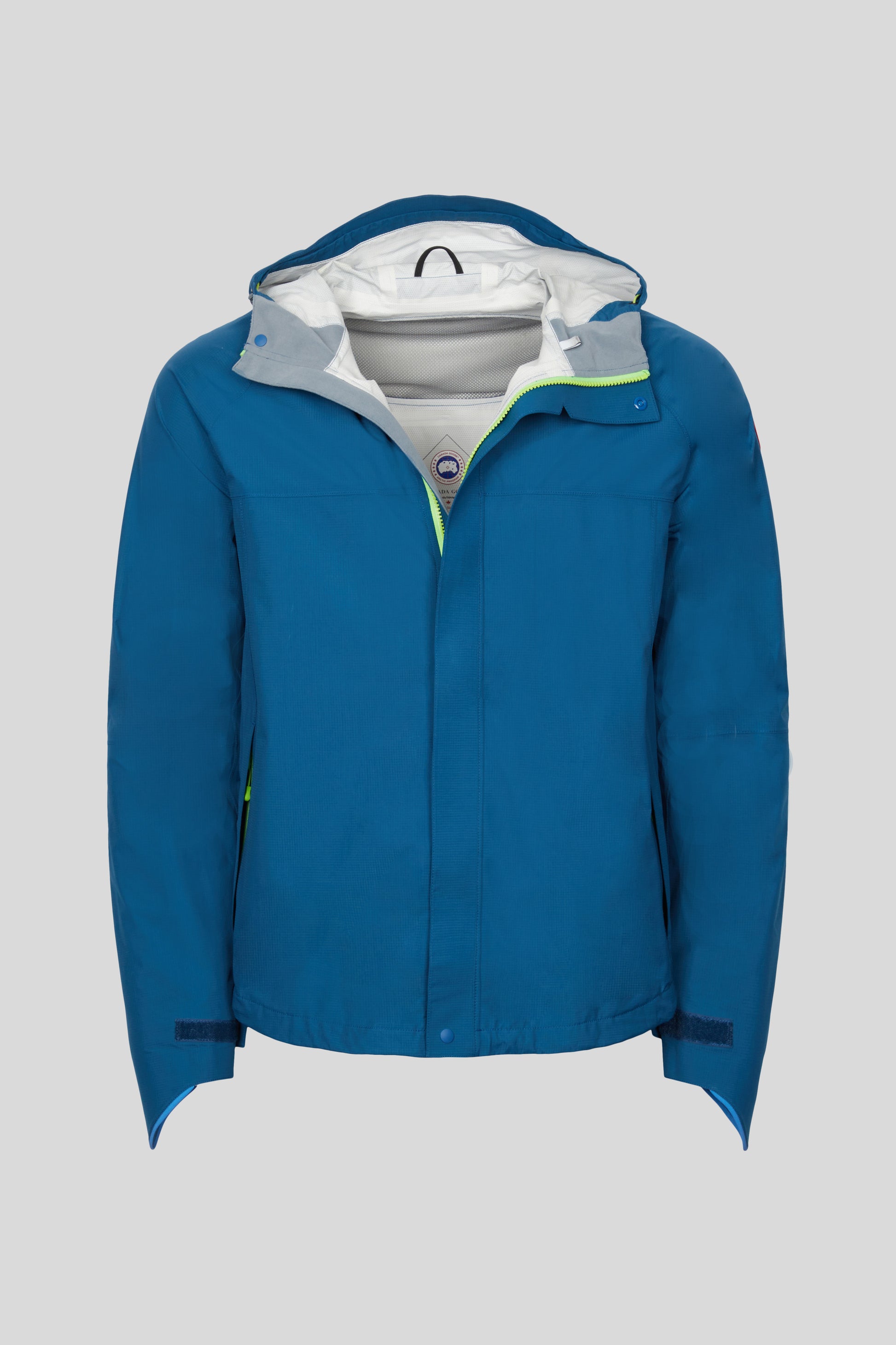 Streamlined, hip-length waterproof shell protects from heavy downpours.